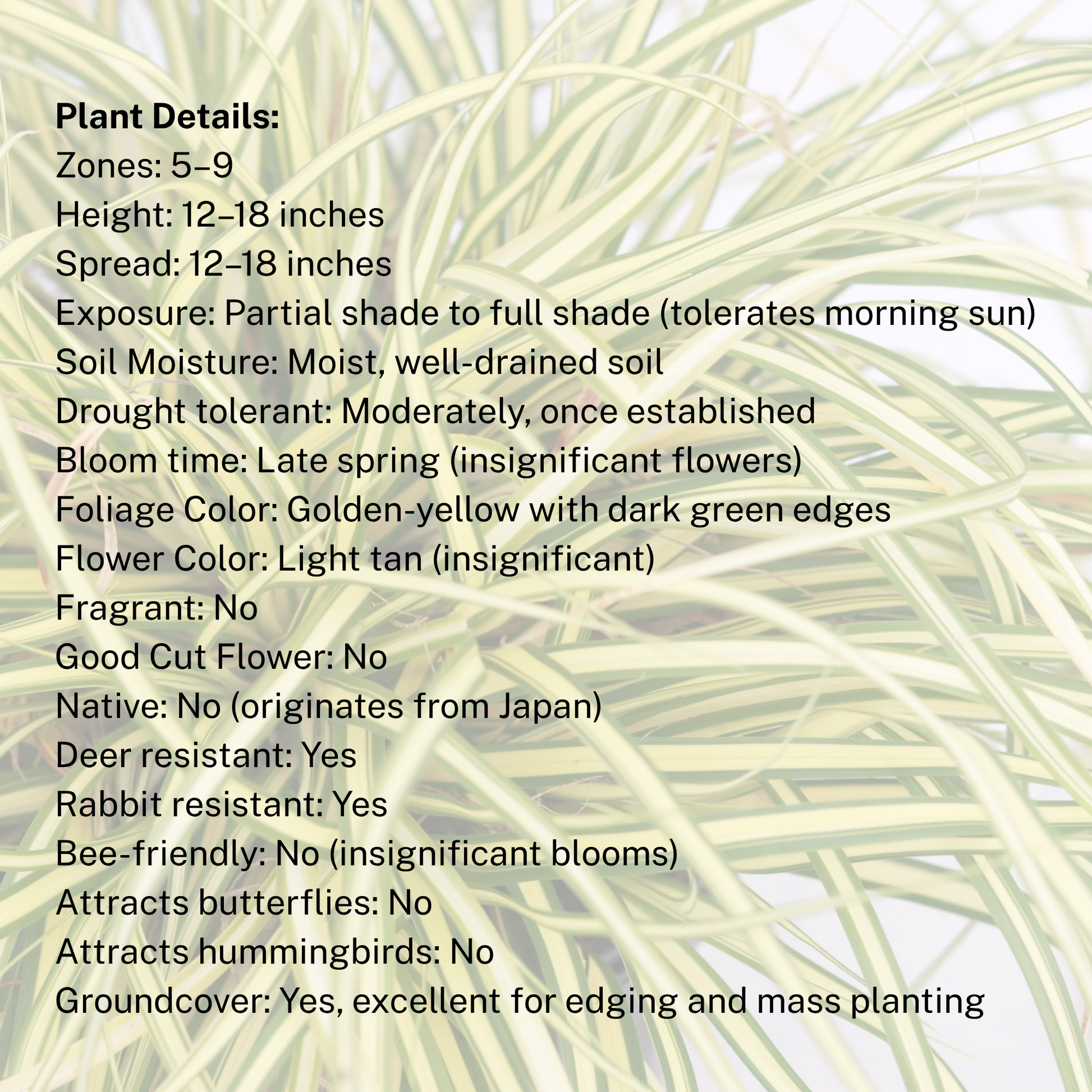 Elevate your landscape with Carex 'Evergold', a sophisticated ornamental sedge that brings year-round elegance to shaded spaces. The luminous golden-yellow leaves with deep green margins create a graceful, fountain-like presence that softens hard edges and illuminates dim garden areas with natural radiance.