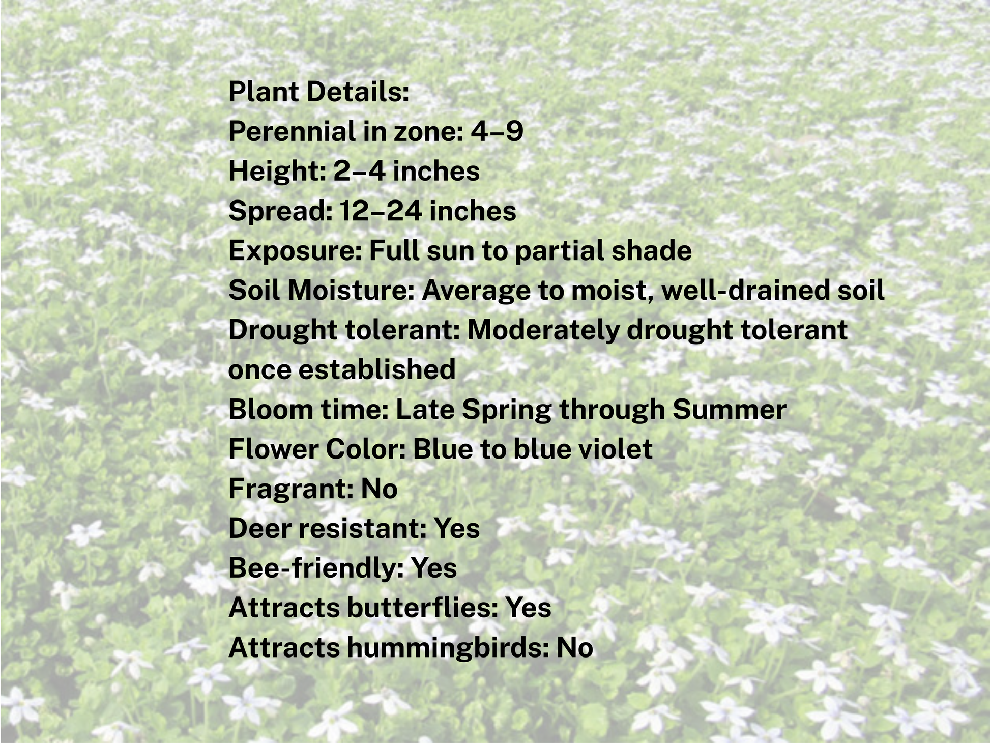 Isotoma fluviatilis, commonly known as Blue Star Creeper, is a low-growing, spreading perennial groundcover valued for its tiny star-shaped blue flowers and dense, mat-forming growth. It fills in beautifully between stepping-stones, along walkways, and in rock gardens, creating a soft carpet of color. Hardy and adaptable, this plant provides long-lasting blooms with very little maintenance.