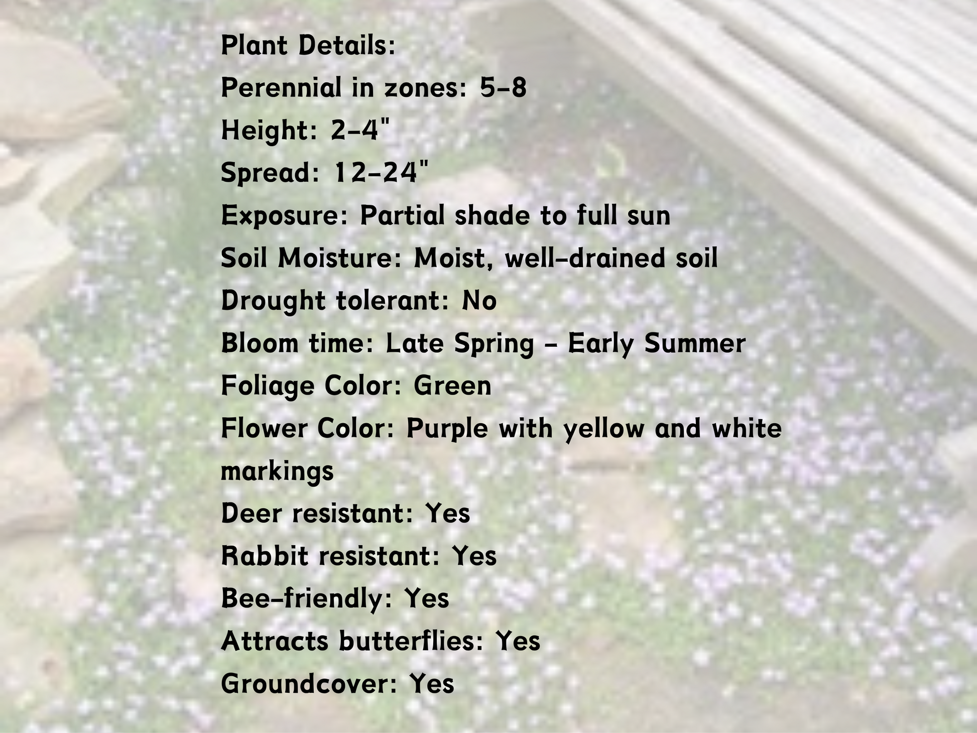 This beautiful, fast-growing, low-maintenance perennial forms a lush, dense carpet of green foliage, making it an ideal groundcover for moist areas. In late spring to early summer, it produces enchanting purple, snapdragon-like flowers with yellow and white accents, bringing vibrant color to pathways, borders, and rock gardens.